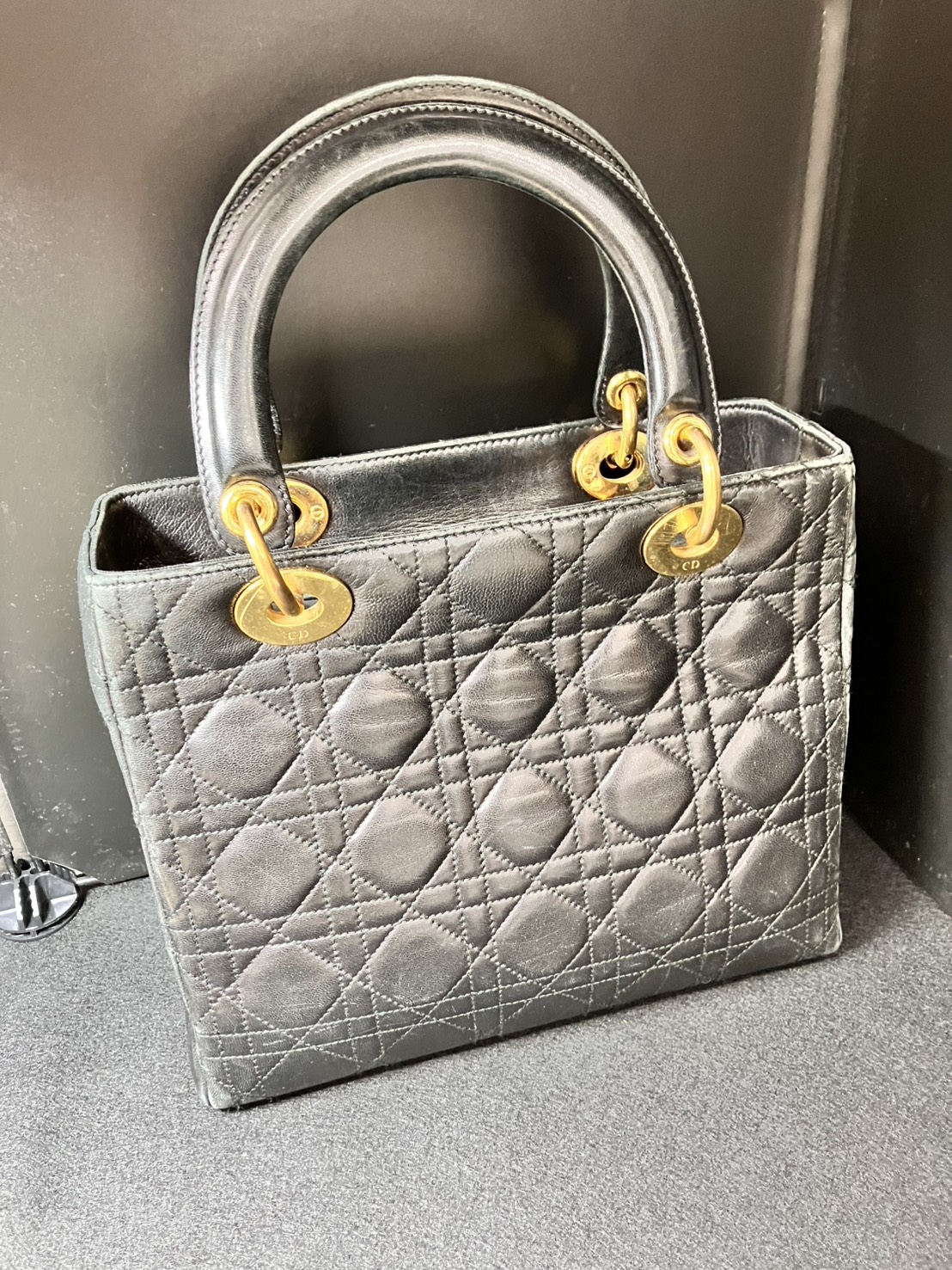 格子柄ステッチが特徴的なデザインのレディディオールのハンドバッグ。