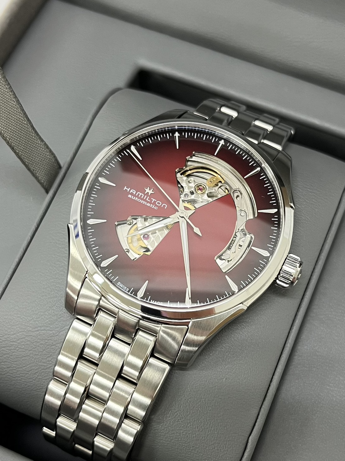 こちらのモデルジャズマスターは、自動巻きのムーブメントと裏蓋や文字盤の一部がスケルトンとなっており、精密な作動が見えるのが、個人的には男心をくすぐるように思えます。